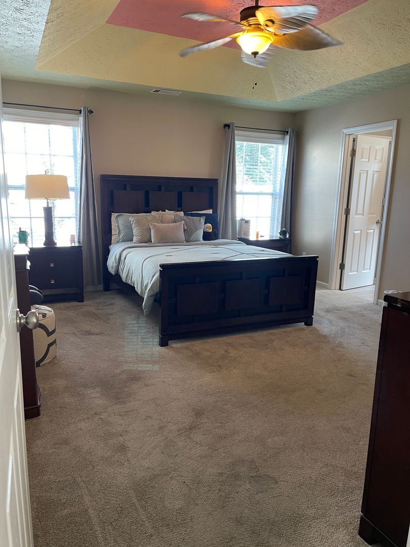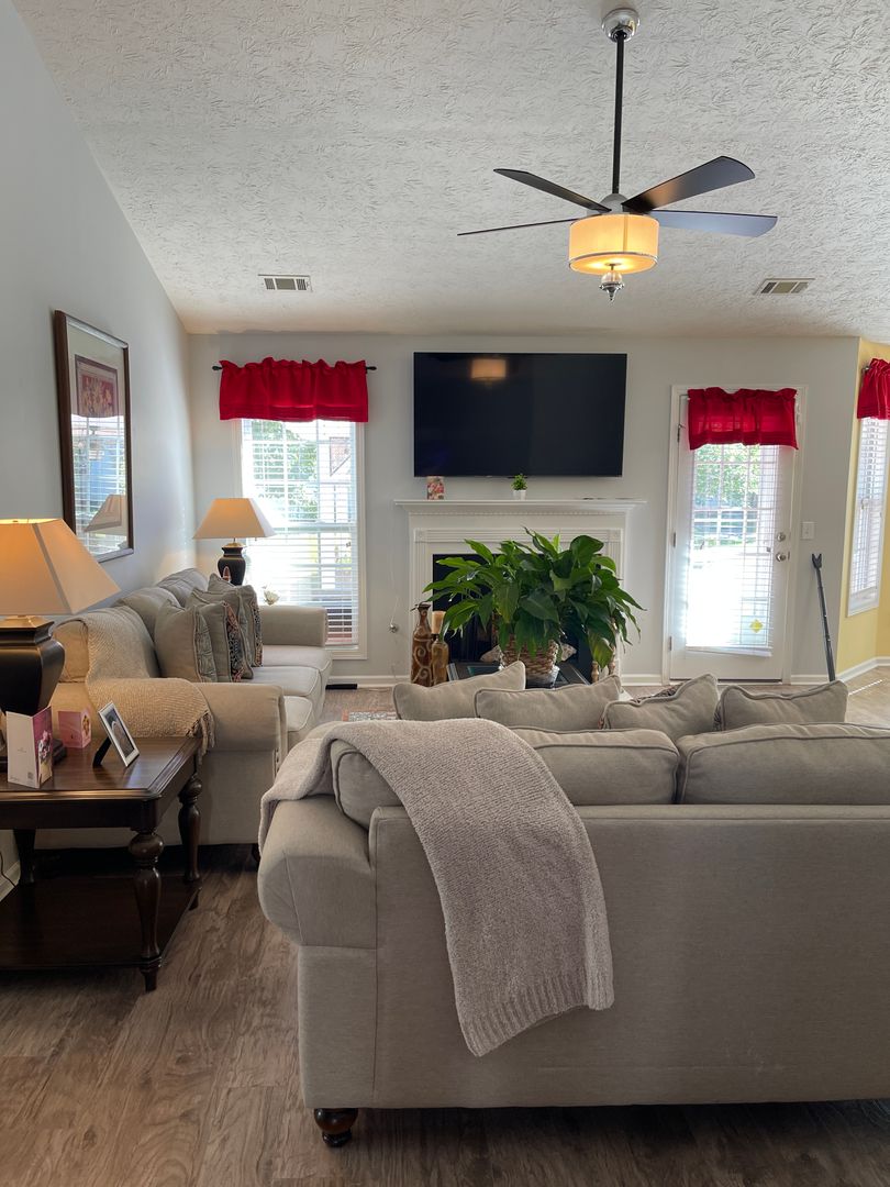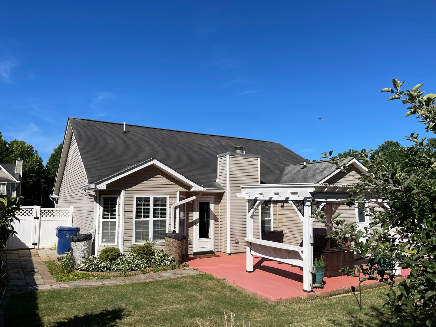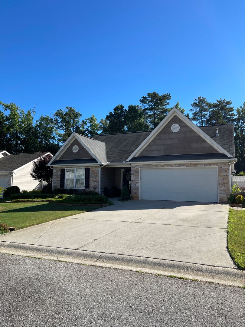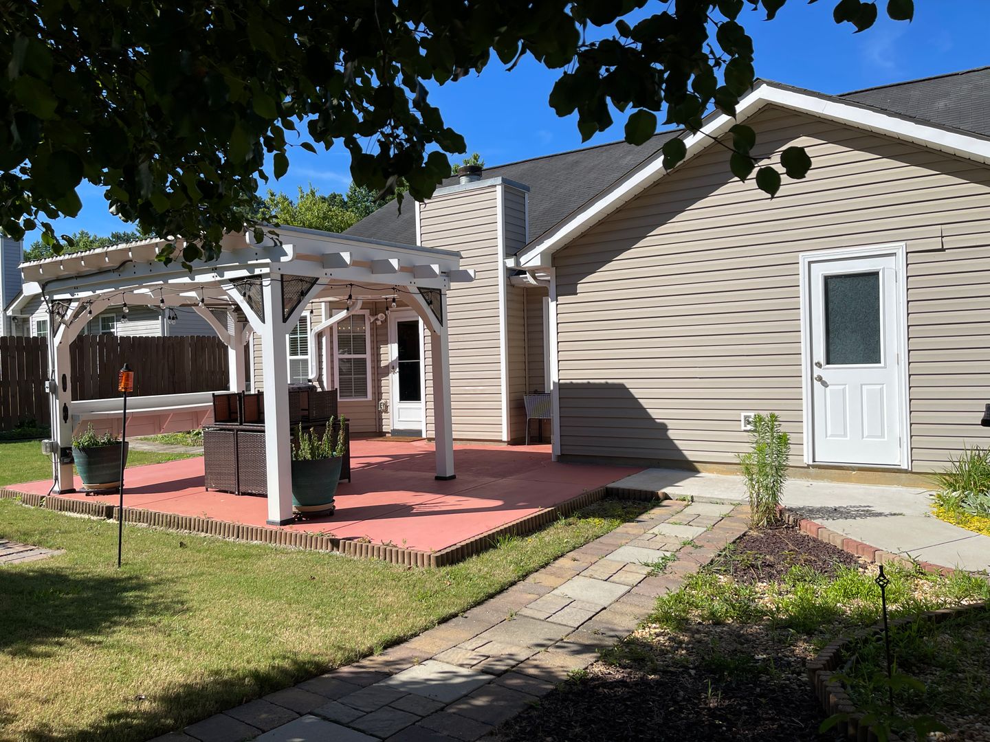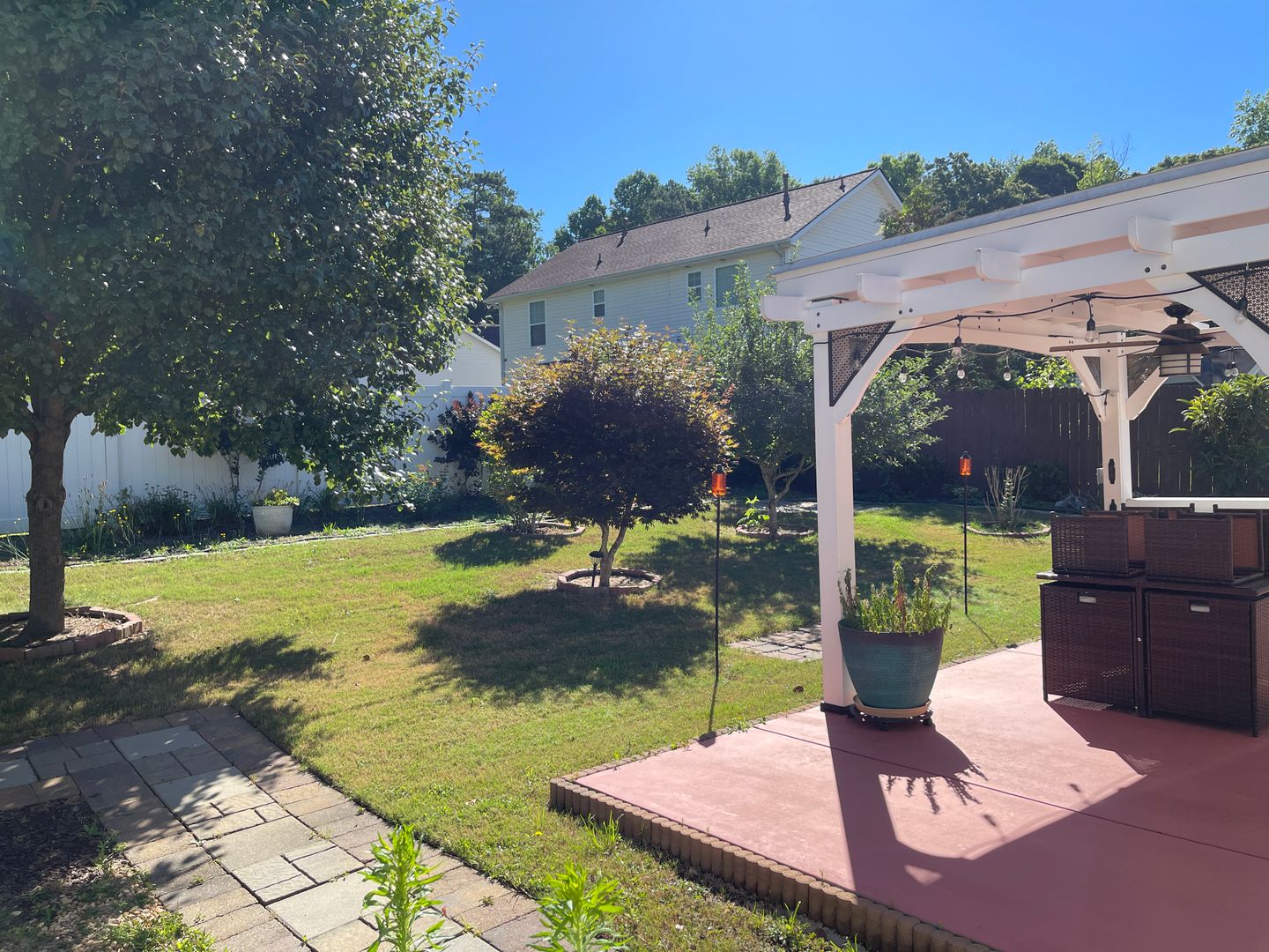 Beautiful 3 bedroom 2 bath ranch is ready for you to call home! Entering into the home you have a view of the spacious living room. 2 of the 3 bedrooms are to the left of the foyer along with the hall bathroom. Both bedrooms have spacious closets and ceiling fans. Spacious living room has lots of natural light, fireplace, vaulted ceilings with ceiling fan and is opened to dining area and galley kitchen. Kitchen has natural color cabinet with black solid surface counters and is equipped with electric range, built in microwave, dishwasher and refrigerator. Oversized primary has vaulted ceilings with ceiling and a large walk in closet. Ensuite has custom tiled walk in shower, double sink vanity, linen closet and door to exterior yard. Very well landscaped fenced private back yard offers a large raised garden, patio with pergola and storage shed. Lawn maintenance can be added to monthly rent for an additional $100. Small pets are welcomed with a non refundable pet fee.